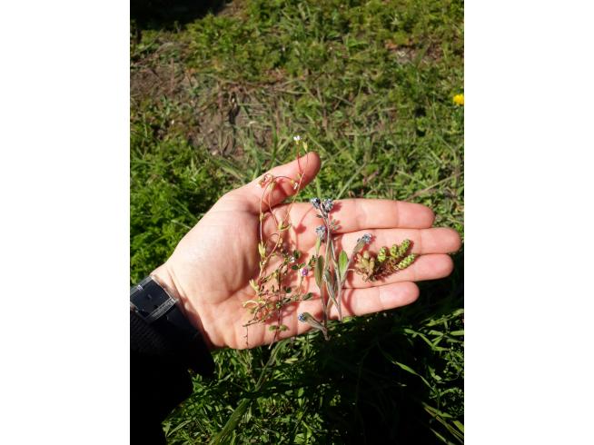 BS: Hier ist was Schönes! Das gelb blühende Frühlings-Greiskraut. Das sieht man oft an S-Bahngleisen. Dazwischen wächst ein Steinbrech, viele Arten dieser Pflanzengattung kennt man von Felssandorten aus den Alpen. Das hier ist der Dreifinger-Steinbrech, eine in Berlin etwas seltenere Art, die sich auf hiesigen Brachflächen immer weiter ausbreitet, besonders entlang von Bahnanlagen. Hier ist noch eine Kresse, die behaarte Schaumkresse, verwandt mit der Kresse, die man auch essen kann. Das hier ist Mauerpfeffer, das ist eine Sukkulente, die schmeckt ein bisschen nach Pfeffer. Dazwischen steht noch eine andere Art, das Fünfmännige Hornkraut, das ist ein weißes Nelkengewächs. Außerdem das Rasen-Vergissmeinnicht und die Platterbsen-Wicke. Ein faszinierender Mikrokosmos!