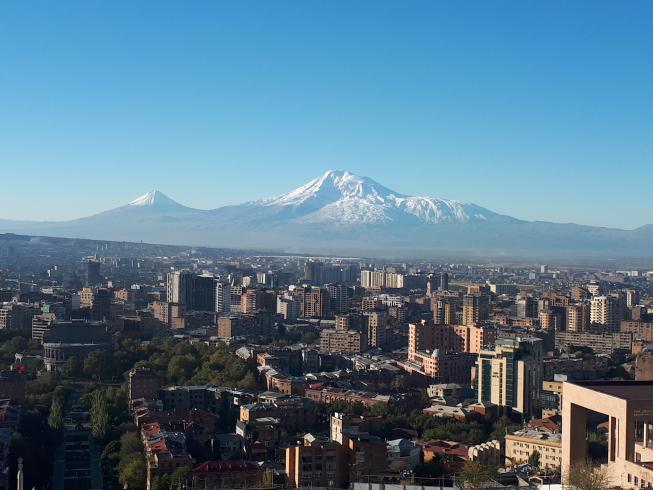 Der Himmel ist klar und die Sonne scheint – ich kann zum ersten Mal den Ararat aus dem Fenster sehen, mache sofort ein Foto und beschließe zur Aussichtsplattform über den Kaskaden zu laufen. Wie nah der plötzlich ist! Ich kann nun verstehen, warum er so ikonisch ist …