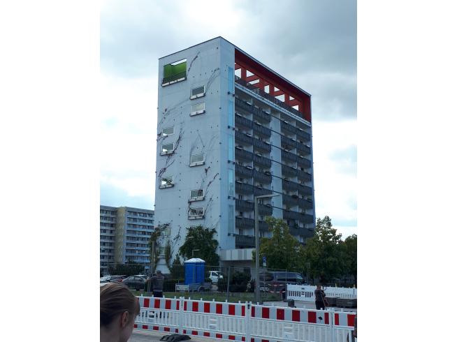 Wir kommen vorbei an Gedenktafeln für Brigitte Reimann und das erste Plattenbauelement, das 1957 aus industrieller Herstellung hier verbaut wurde,
