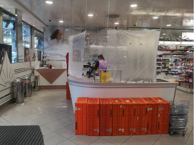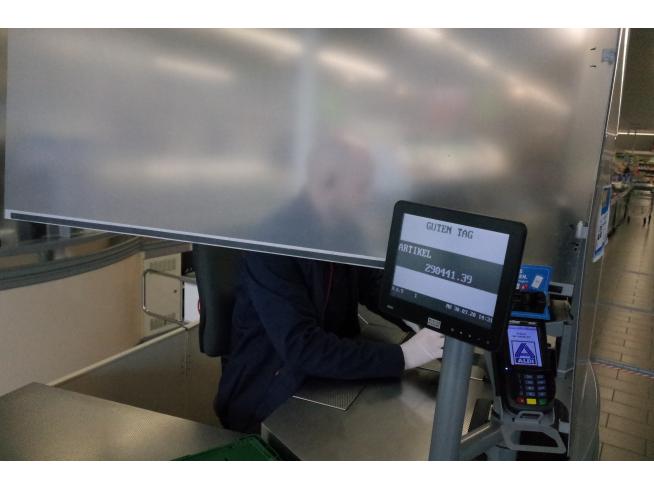 In an oval shape like a riot police helmet these objects fulfil their inherent purpose in their functionality. Some made from milky acrylic glass the interaction with the person beyond the counter gets a somehow cloudy, pixilated experience. Attached to the shelf with silver lined duct tape – an all time favourite of the DIY-workmansship – or hanging on thin strings almost invisible from the ceiling this objectoriented design, with its hands-on, low-material concept, facilitates a broader key element of our ever secure environment.