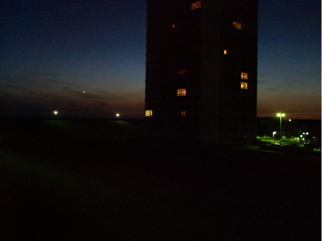 Hochhaus steht hier, hell erleuchtet, ihm gegenüber ein Baumarkt und Büros.