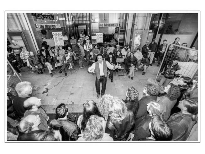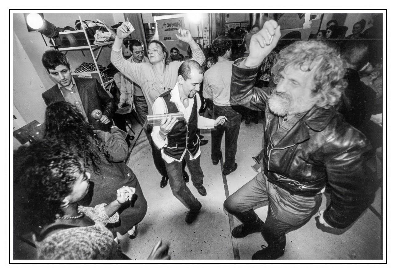 Später kamen auch Anfragen aus England und Irland, ob sie auftreten können. Aber als wir gesagt haben, es gibt nur einen Kasten Bier, da waren sie raus. Wie gesagt, Programm in der Mission war Musik, Lesungen, Theater, Brot und Spiele oder auch die langen Filmabende. Es war ja verboten, in der Mission zu übernachten. Deswegen haben wir es so gemacht: Ich habe drei Filme nonstop hintereinander gezeigt, dann war das Programm der Mission nicht um 23 Uhr zu Ende, sondern morgens um 6 Uhr, mit Zigarettenpause und so. Und die Leute haben dabei oder danach geschlafen. Ich konnte sie ja schlecht auf die Straße schicken, das ging nicht.