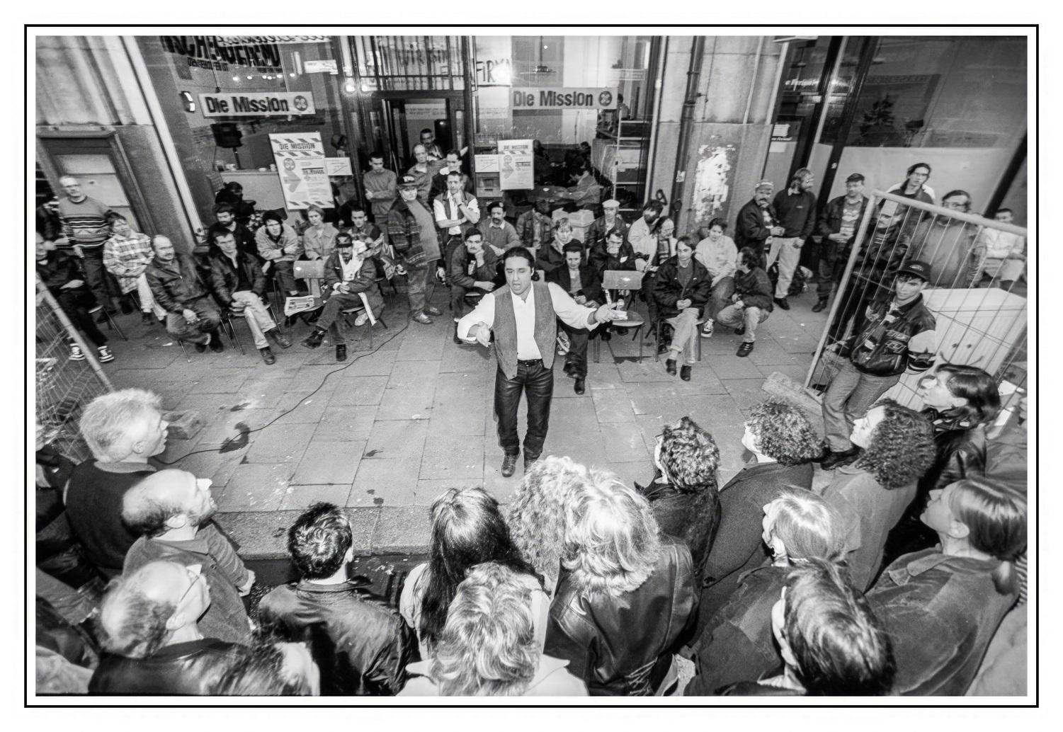 RG: Also ganz ehrlich, das war sehr gut. Die Künstler, die auf der Bühne waren, haben ein sehr dankbares Publikum gehabt. Und die Obdachlosen? Für die war es etwas anderes, man hat sich um sie gekümmert, ihnen wurde etwas geboten, was sie sonst nicht hatten. Obdachlose können nicht ins Theater gehen oder in irgendeinen Club, aber in der Mission hat man es ihnen geliefert. Das war dann bis abends um zehn oder elf Uhr, bei Club Nächten war es bis morgens drei, vier oder fünf Uhr. Ja, sehr viele Obdachlose haben sich da wohlgefühlt. Und wir waren unabhängig. Das darf man nicht vergessen. Du kennst vielleicht Café mit Herz unten in der Bernhard-Nocht-Straße, von da kam der Vorschlag, dass sich alle Obdachlosenhilfe verbinden sollten. Das fand ich einen guten Vorschlag, aber das ist nachher daran gescheitert, dass die Mission das meiste Geld hatte. Die wollten an unser Geld ran und da habe ich Nein gesagt. Wir verdienen schwer unser Geld für die Obdachlosen und finanzieren alles. Weil ihr Spendenaufkommen gering war und die sich sogar davon auch Gehälter gezahlt haben, haben wir Nein gesagt. Ich habe Nein gesagt. Dazu kamen dann noch Vorfälle beim Café mit Herz, da arbeiteten zwei Jungs in der Kleiderkammer und die haben Leute erpresst, vor allem Mädchen. Und da habe ich gesagt: Mit dem Laden keine Verbindung, schmeißt die raus, die die Mädchen erpressen. Ist nicht passiert. Bei uns haben die Hausverbot gehabt. Sowas ging nicht.