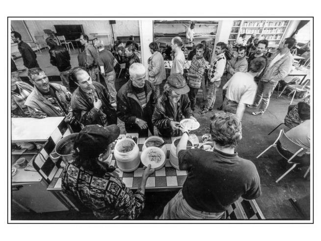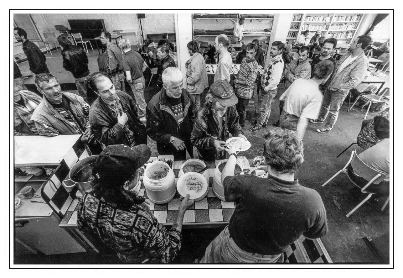 RG: Es stimmt, der Staat wurde entlastet. Zum Beispiel hat uns auch die Hamburger Tafel täglich beliefert, was heute gar nicht mehr möglich ist. Täglich wurde die Mission mit Spenden, sogar Kuchen, angefahren und das wurde auch eins zu eins an unsere Gäste rausgegeben. Da wurde nichts privat genommen, sondern jeder Gast konnte sehen, was von der Tafel reinkam und dass es auch oben verteilt worden ist. Das war wichtig. An der Theke, die wir gebaut hatten, gab es verschiedene Körbe. Der Kuchen kam rein und gleich auf den Tresen, nichts wurde einfach in die Küche gebracht, höchstens das Gemüse zum Putzen. Die Leute mussten sehen, dass da nichts verschwand. Die Helfer durften sich aber auch bedienen, darüber hatten wir dann teilweise Streit. Bei „Von Mensch zu Mensch“ fand ich einen Zettel, auf dem stand: „Warum dürfen die Helfer sich auch bedienen?“ Darauf meine Antwort: „Die Helfer sind genauso obdachlos wie ihr auch, nur dass sie hier eine Leistung erbringen, schlafen und arbeiten. Warum sollen sie schlechter gestellt sein als ihr? Wenn ihr das so seht, dann können wir die Spenden auch erstmal nur an die Helfer verteilen und danach kommt ihr dran. So wie überall anders. Wollt ihr das?“ Danach war Ruhe. Denn die Helfer schlechter zu stellen als unsere Gäste, das ging gar nicht. Das war aber einer von vielen Streitpunkten zwischen Gästen und Helfern.