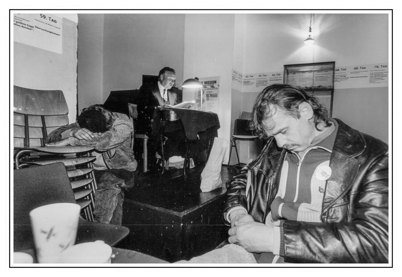 RG: Oben waren vier Betten. Wenn Leute in die Mission kamen und müde waren, konnten sie sich in die Betten legen. Aber wer zuerst kam, mahlt zuerst. Und ganz ehrlich: Wir waren keine Bank. Wir hatten andere Öffnungszeiten. Wenn die Bank sagt, „wir machen um neun auf“, machen die auch um neun auf. Wenn bei uns Leute vor der Tür standen, haben wir aufgemacht. Keine Bank-Mentalität: Wer draußen vor der Tür stand, konnte auch vorher schon reinkommen. Das haben die Leute dann soweit ausgenutzt, dass sie immer sofort auf die Betten wollten. Da haben wir gesagt: „Pass mal auf, wenn ihr jetzt immer früher dasteht, nur um die Betten zu kriegen, müssen wir dem einen Riegel vorschieben. Wir machen jetzt auch erst pünktlich auf, wie jede Bank. Damit jeder die gleiche Chance hat.“ Das haben sie auch eingesehen. Das war eine Regel, die mir zuwider war. Aber um eine gewisse Gerechtigkeit zu erfüllen, dass jeder auch die Chance hat auf eins dieser vier Betten, musste das sein. Sie sind aber auch an den Tischen eingeschlafen. Wir hatten zwei Sitzreihen hinten mit alten Kinositzen, die waren auch immer belegt und hatten den besten Überblick. Von da aus konnte man alles sehen.