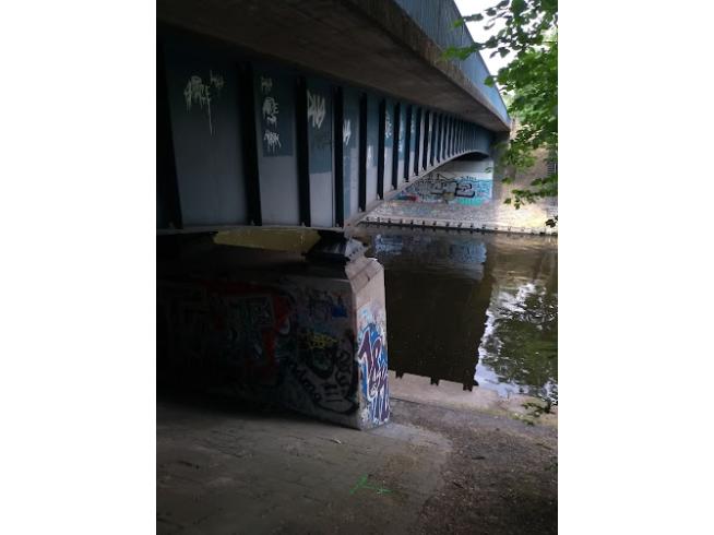 Vom Balkon aus schaue ich auf ein rundes Wiesenstück, das von Holunderbüschen eingerahmt wird. Rechts ragt ein für die Gegend typischer Betonbau mit hellgelber Dekoration in den Himmel. Kleine Laternen mit Kugelköpfen hocken wie halb eingegrabene Zwerge an den Wegrändern. Hinter der trockenen Wiese beginnt dichter Baumwuchs, dahinter ein kleiner Schleichweg und kurz darauf stürzt die Erde steil in den Teltowkanal ab. Dieser etwa zwanzig Meter abfallende Hang ist mit undurchdringlichen Pflanzen und Bäumen bewachsen. Der Urwald gibt nicht einen kleinen Blick auf den Kanal frei. Nur über zwei alte Treppen ist ein Zugang zum Wasser möglich. Hier sitzen wir oft unter der Brücke. Lastkähne gleiten durch das Wasser wie durch dunkelgrünes Gelee. Kilometer von seltsamen Fäden schwimmen reglos auf der Oberfläche. Es ist nicht ungewöhnlich, daß tote Fische tagelang auf dem Wasser treiben. Der Verkehr holpert über uns hinweg. Die Brückenpfeiler ächzen jedes Mal unter der Last wie das Herz eines alten Mannes. Tagsüber malen wir unsere ersten großen Pieces hier. Immer an der gleichen Stelle. Wir überstreichen unsere Bilder und probieren es stets aufs Neue. Halil hat mehr drauf und zieht meist die Buchstaben vor, die ich dann ausfülle. Die leeren Sprühdosen werfen wir in eine Lücke zwischen dem Stahlgerüst und den Betonpfeilern.