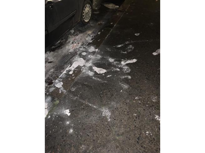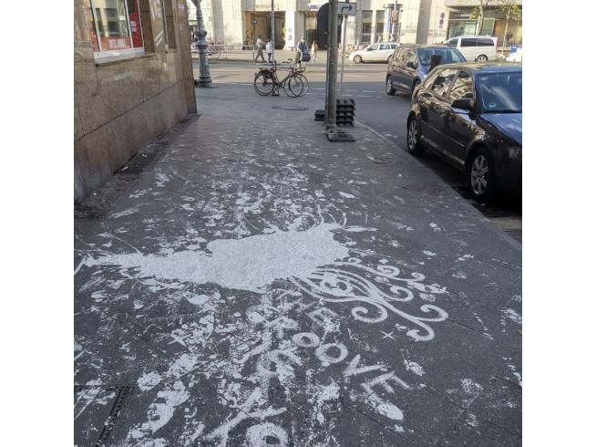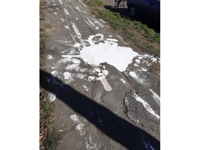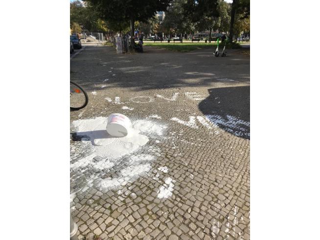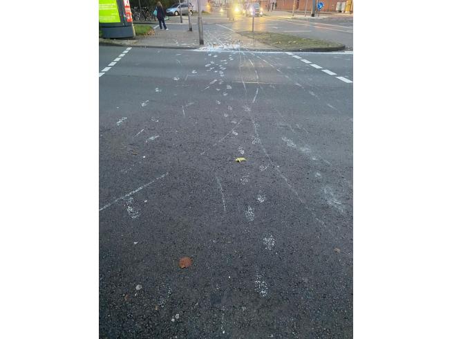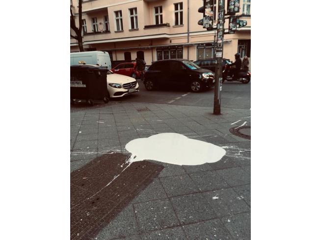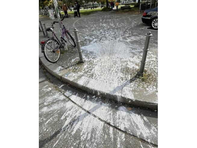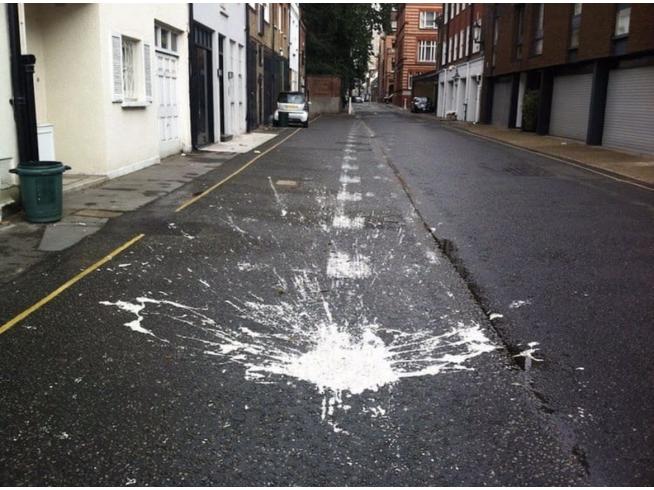 Der nächste Flaneur (in diesem Falle Spaziergänger) trägt unbewußt die Farbe mit seinen Schuhsohlen weiter, das nächste Auto oder Fahrrad kommt bestimmt – dann weißbereift (Schneeassoziation!) genauso wie die Straße. Oder der Fleck trocknet einfach ein und verändert von nun an den Gesamteindruck des Ortes.