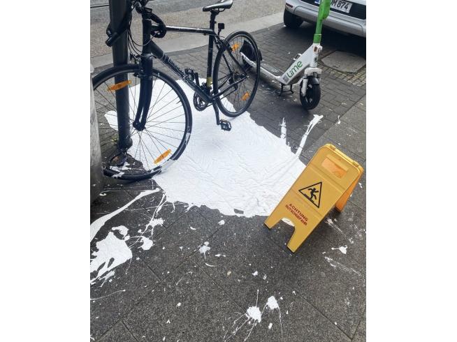 Wenn aus Unfällen Schönheit und aus (noch so unbeabsichtigtem) menschlichem Handeln Kunst wird, sind Künstler am Werk (in diesem Falle Flaneure im Sinne von Walter Benjamin und Franz Hessel). Einige wurden von Dana Engfer und Moritz Otto eingeladen, das zu tun, was sie am Besten können: genauer hinzusehen und Tatorte zu Projektionsflächen zu machen. Mit dem Smartphone dokumentierte Mißgeschicke mit weißer Farbe (auf Französisch klingt das natürlich schöner, und darum geht es ja auch) wurden eingesandt und auf Instagram veröffentlicht.