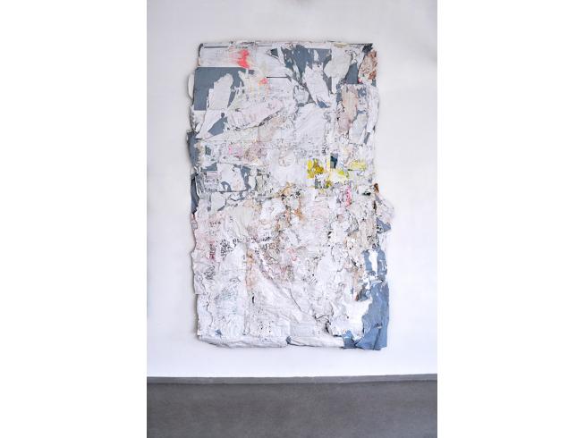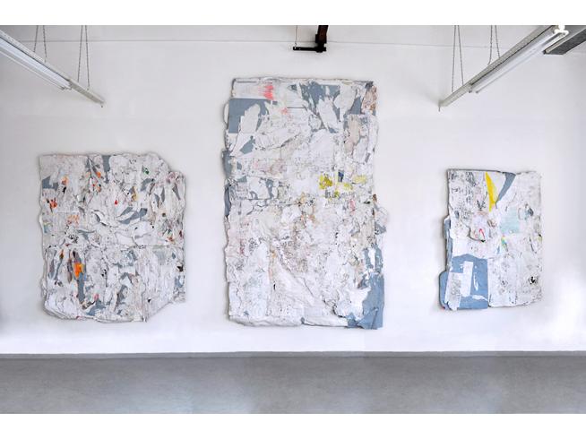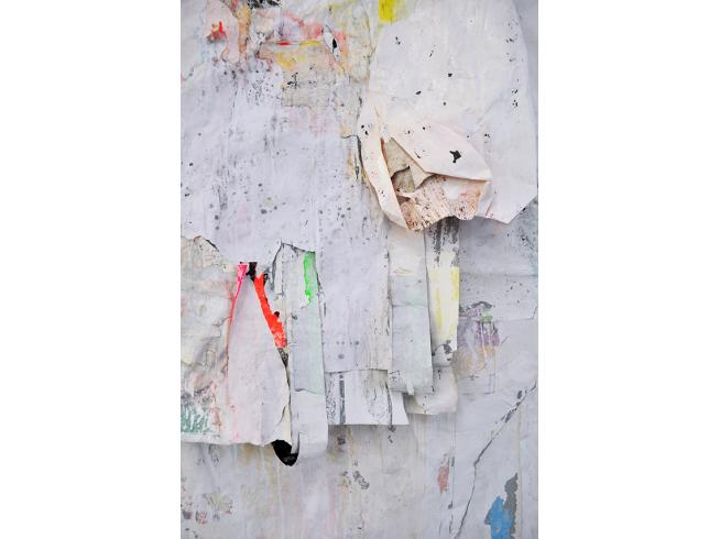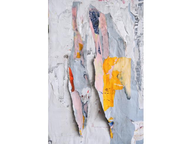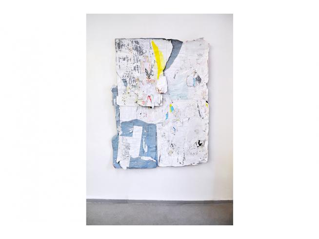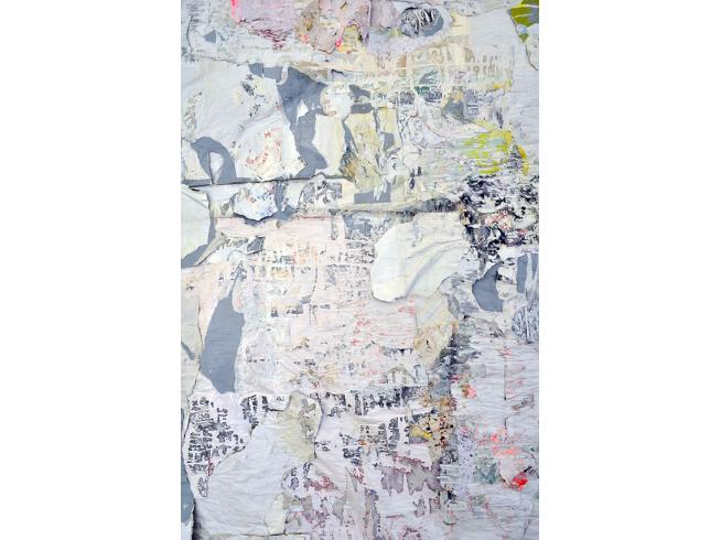 Übereinander gelegte Papierschichten, die aufgrund ihrer Dicke von der Wand abstehen. Ein Muster aus abgerissenen Schichten und einzelnen Papierfetzen, die erkennbar abstehen. Eine Papierschichtung in weiß-grau, mit verschwommenen Farbtupfern. Farbe, die sich in Kleister aufgelöst hat und hinunter läuft. Bilder, die an den Rändern ausfransen. Die Künstlerin Kirsten Heuschen sammelt Plakate oder besser: Plakatwände und verwendet deren Rückseiten, um daraus eigene Arbeiten zu formen. Eine Technik, die an die Décollage anknüpft, die Künstler*innen des Nouveau Réalisme in den 1950er und 60er Jahren entwickelt haben und die im Abreißen und Weiterverarbeiten von Plakaten bestand. Sie geht mit mehreren künstlerischen Schritten einher: Die Aneignung von alltäglichem Material, die Umwertung von Wertlosen und die Abstraktion von Botschaften, die uns in Form von Plakaten jeden Tag ansprechen und animieren wollen. Kirsten Heuschen geht noch einen Schritt weiter, indem sie das Collage-Material mit Cyanotypie und anderen Substanzen bearbeitet, so dass Chemigramme entstehen. Mit einer Emulsion malt sie dafür direkt auf die Plakatwände, die mit der fotografischen Substanz reagieren. Die Spuren des chemischen Prozesses werden sichtbar und bilden eine Analogie zu den Spuren, welche durch die körperliche Geste des Reißens der Plakate entstehen.