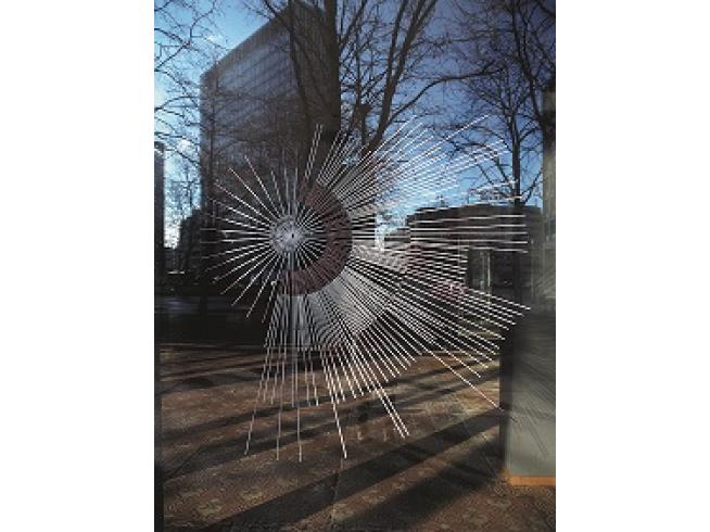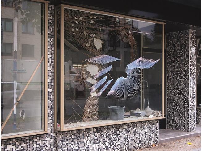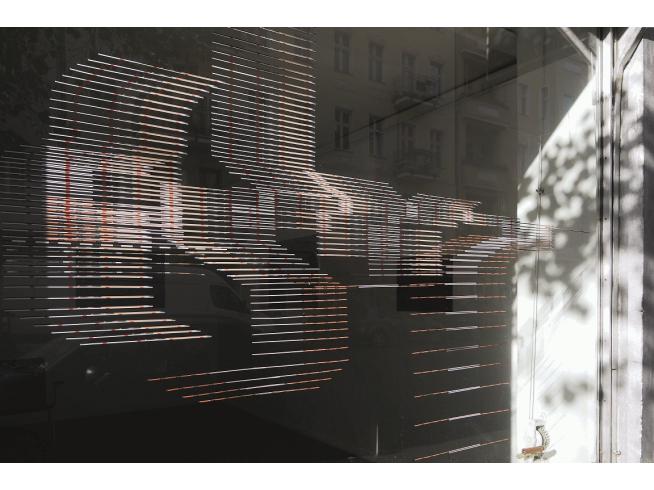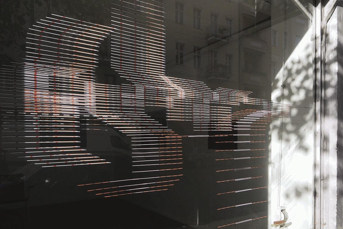 Du meinst, dass die CUTS eigentlich nicht an der Glasscheibe aufhören, sondern dass die Arbeit sich ausdehnt in alle Richtungen? Genau so ist es gedacht, ich finde das eine schöne Vorstellung. Die Fotos zeigen deutlich, dass sich einerseits der Vordergrund auf der Scheibe widerspiegelt und andererseits, dass man den Innenraum sieht, wenn man genau hinschaut. Es hängt stark von der Perspektive ab, wie sich das Bild verändert, auch je nach Lichteinfall.