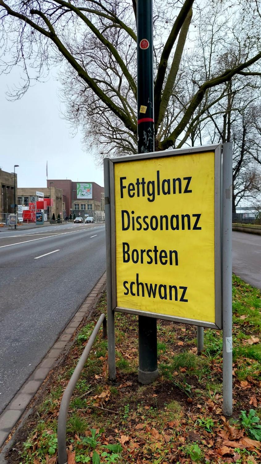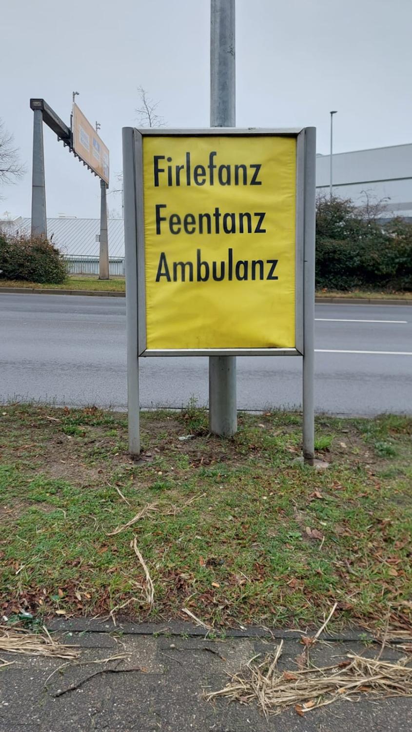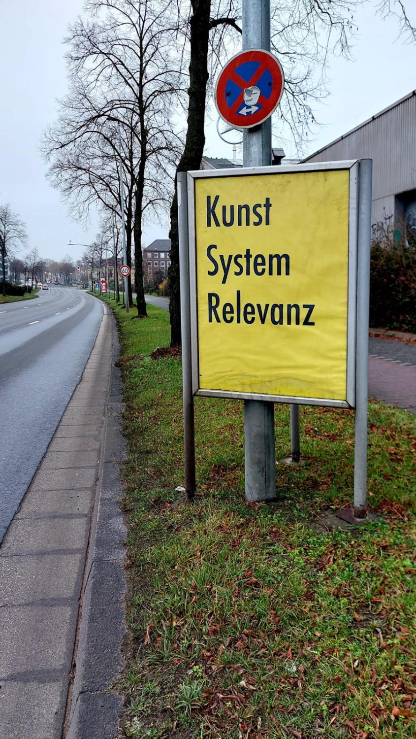 Das Team des Neuen Kunstraums Düsseldorf (NKR) hat seinen Ausstellungsraum verlassen und eine Plakataktion im öffentlichen Raum initiiert, heißt: er hat Plakate an Straßen aufgestellt, die man bequem aus dem Auto heraus lesen kann. Kunst, System, Relevanz steht dort, untereinander, schwarz auf gelb, oder etwas anarchistischer: Firlefanz, Feentanz, Ambulanz. Noch zwei weitere