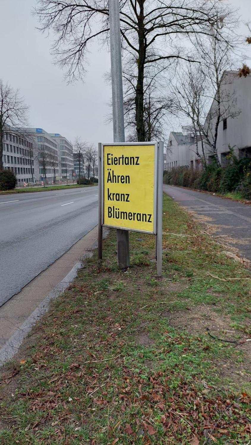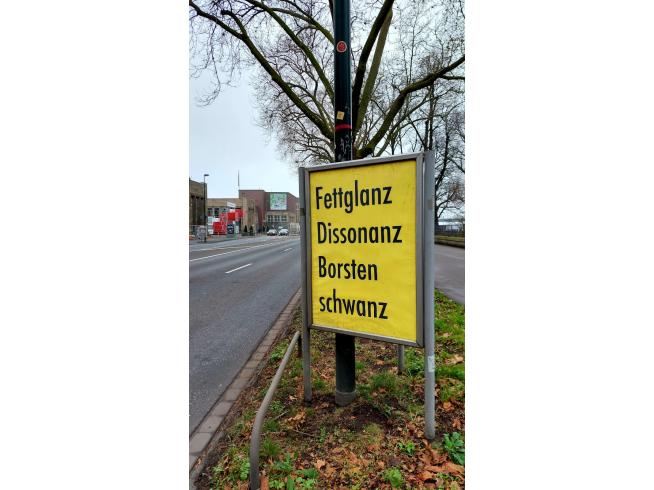 Plakate gibt es, ähnlich poetisch-humorvoll-abgründig, dessen Begriffe ebenfalls auf ‘anz‘ enden: Fettglanz, Dissonanz, Borstenschwanz und Firlefanz, Ährenkranz, Blümeranz. Gerne würde man ergänzen: Populanz, no Markus Lanz, Krisentanz usw. Allein durch diese kurzen Schmunzelmomente, die die Plakate hervorrufen, hat die Kunst einmal mehr ihre Relevanz bewiesen.