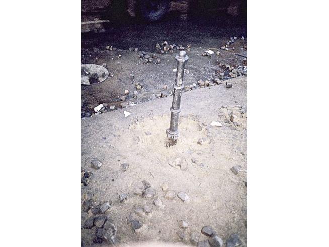 Horst Wellmann aus Frankfurt am Main ist der größte Pollerhersteller Deutschlands. Seine Firma »Wellmann Stahl- und Metallbau« lässt diese in Ungarn produzieren. Sein »Standard- Modell«, ein »schwarz patinierter Aluminium-Pflock im Nostalgie-Look«, wird nach Kreuzberg wegen der regelmäßigen 1. Mai-Randalen mit verlängertem Anker (»Stahlrohrkern«) geliefert, im dortigen Bezirksamt bezeichnet man die Poller seit 1987 als »Kreuzberger Penisse«, wie mir der ehemalige Bezirks­bürgermeister Walter Momper mitteilte. Weil diese aber dennoch an solchen »Kampftagen« massenhaft rausgerissen werden – um nämlich an die »Kreuzberger Argumente« (die kleinen, zum Werfen besonders gut geeigneten Pflastersteine) heranzukom­men –, deswegen haben viele Kreuzberger solche Poller zu Hause stehen und so mancher Hausmeister hat sie dort schon in seinem Hinterhof erneut als Poller eingepflanzt. Auch in einigen Theaterstücken wurden sie wiederverwendet: entweder als Statisten (»stumme Polizisten«) oder als Requisite (Kreuzberger Ambiente andeutend). Dergestalt hat man dann doch wieder wenigstens beispielhaft etliche Staatspoller in Hausmeisterpoller umfunktioniert. So wie man dort auch aus Staatsland wieder Gemeindeland gemacht hat, indem inzwischen die kleinen Fleckchen Erde (Baumscheiben) um die Straßenbäume fast überall eingezäunt, bepflanzt und mit Sitzgelegenheiten ringsum verse­hen wurden. Diese ganzen »Kämpfe« (um Poller und Baum­scheiben) gehören jedoch streng genommen noch zur Vorwende­zeit, die kommenden Schlachten werden mit bzw. gegen die hydraulischen Poller ausgetragen werden, die technologisch eine neue Eskalationsstufe im Kampf um den öffentlichen Raum eingeleitet haben.
