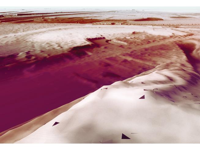 Der Künstler bearbeitet das digitale Material und fügt den Karten Lichtakzente, Schattenwürfe sowie Wolken am Himmel hinzu. Zudem gestaltet er die Grafiken in unterschiedlichen Farben und provoziert auf diese Weise heterogene Assoziationen: mal sieht es nach Mondoberfläche, Schnee- oder Wüstenlandschaft aus. Dabei fallen kleine schwarze Rechtecke ins Auge. Sie markieren Lücken, an denen entweder keine Daten gemessen werden konnten, oder die als Fehler beim Rendern entstehen.