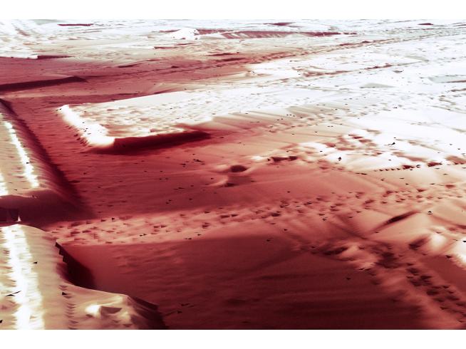 Ein weiterer Bearbeitungsschritt besteht darin, dass er die Oberflächen aus unterschiedlichen Perspektiven und Höhen darstellt. Mal ist ein Horizont erkennbar und die Landschaft wirkt extrem flach, bei anderen werden kleine Ausschnitte heran gezoomt und die Höhenunterschiede treten hervor. Auf einer Grafik wird so nah an die Oberfläche heran gezoomt, dass sie wie gerastert wirkt. Durch die Vergrößerung wird das Bild extrem pixelig, so dass die digitale Quelle überdeutlich wird.