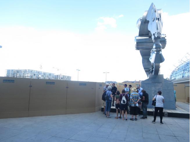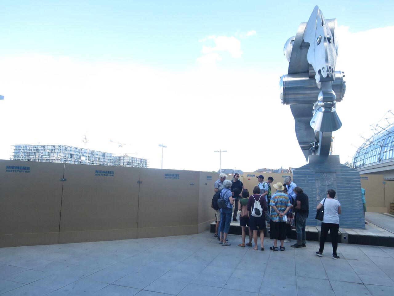 Since we had planned the walk one week before, two public spaces have been made inaccessible: one being the terrace of the central station, we examine the outdated plans for Europacity and the vestiges of the former Europe Square, where a skyscraper is being constructed that will soon overshadow the station itself.