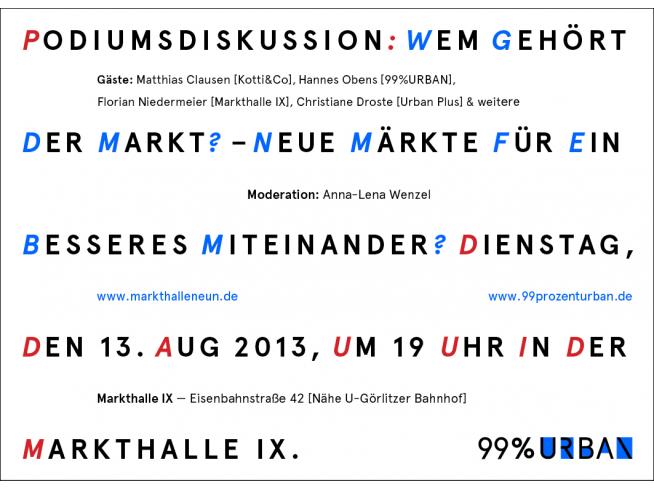 Im August haben wir zunächst im Hamburger Gängeviertel die Ausstellung von Denis Sennefelders Fotoserie Gegen Ende präsentiert und nur zehn Tage später eine lebhafte und kontroverse Podiumsdiskussion zum Thema Wem gehört der Markt? Neue Märkte für ein besseres Miteinander? in der Markthalle IX in Kreuzberg ausgerichtet. Wollten wir einerseits die durch unsere Artikel angestoßenen Diskussionen und Gespräche noch einmal mit einer breiteren Öffentlichkeit diskutierten, ging es uns anderseits darum, konkrete Vorschläge für die Diversifizierung der Markthalle vorzustellen. Gäste waren Matthias Clausen von der Mietergemeinschaft Kotti & Co, die Sozialwissenschaftlerin Christiane Droste und der Markthallenbetreiber Florian Niedermeier.[v] Hier schließt sich der Kreis zu unseren ersten Reportagen über die Kreuzberger Markthalle IX.